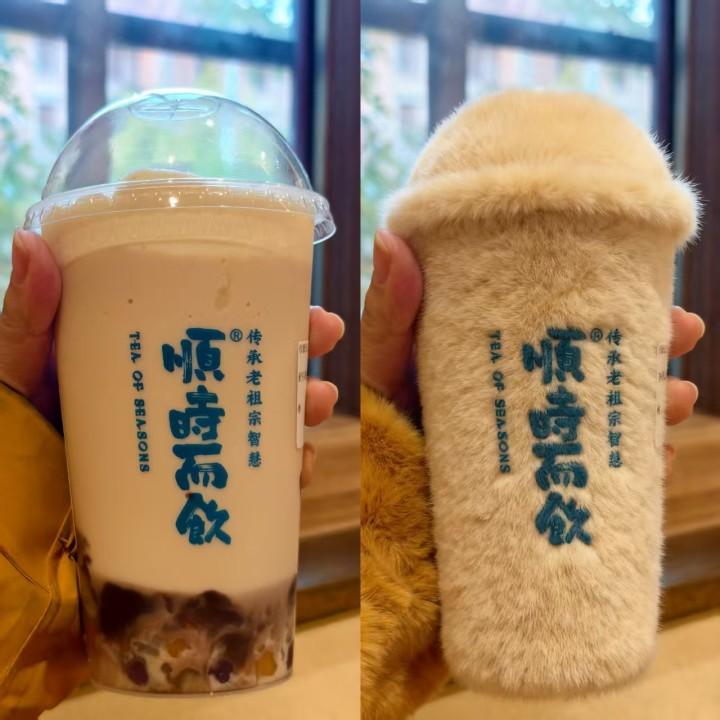 茶饮品牌成为最早下场的玩家之一。茶百道不仅将经典奶茶杯杯“裹上”绒毛,还推出了真正的毛绒奶茶杯;古茗为招牌奶茶也生成了毛绒杯身;瑞幸则把生椰拿铁杯变成浅棕短绒质感,杯套上的小鹿 Logo也成了“毛绒版”。