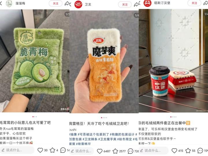 而除了茶饮品牌,其他品牌也都纷纷跟上,美妆品牌把口红管P成毛绒款,零食品牌给薯片袋加了绒毛边,连家电品牌都晒出了“毛绒版”微波炉。
