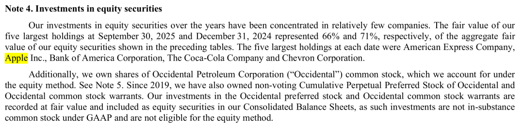 伯克希尔表示,多年来,股权投资主要集中在少数几家公司。截至2025年9月30日和2024年12月31日,我们前五大持股的公允价值分别占股权投资总公允价值的66%和71%。这五大持股分别是:美国运通、苹果、美国银行、可口可乐以及雪佛龙。此外,我们还持有西方石油的普通股。