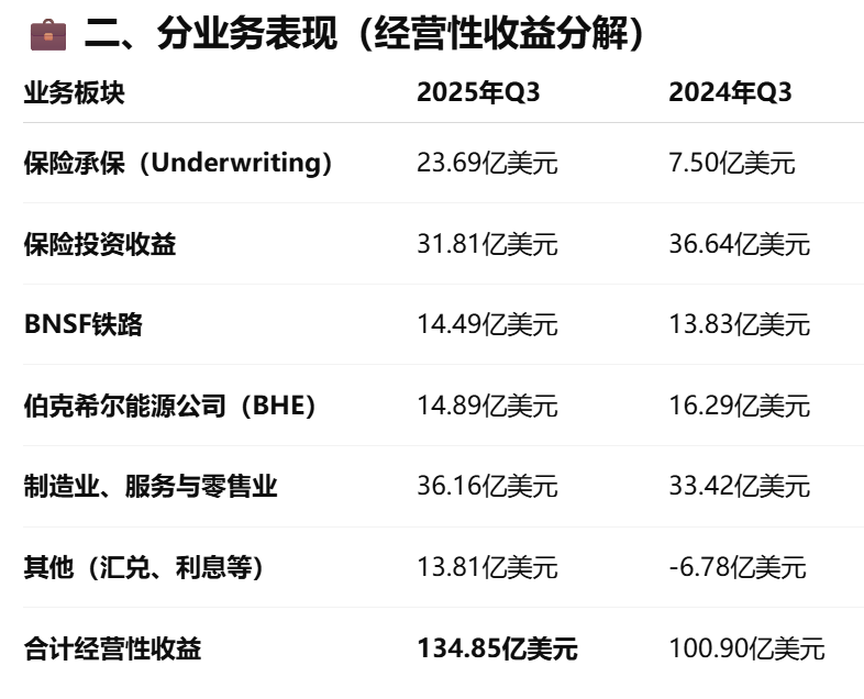 伯克希尔来自其全资业务(包括保险与铁路等)的经营利润(剔除部分投资结果)在第三季度同比跃升34%,至134.85亿美元。增长主要源于保险承保收益飙升200%以上,达到23.7亿美元。