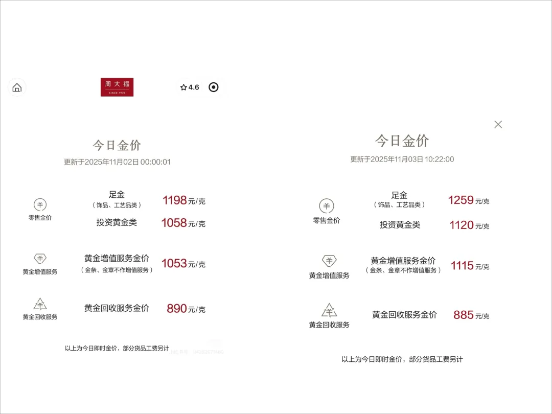 今天,周大福饰品和投资类黄金的报价从昨天的1198元/克和1058元/克,分别上调至1259元/克和1120元/克。