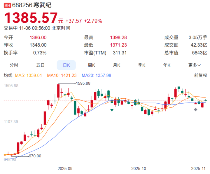 业绩方面,2025年前三季度,寒武纪实现营业收入46.07亿元,同比增长2386.38%,实现净利润16.05亿元,上年同期亏损7.245亿元,基本每股收益3.85元/股。对于业绩变动的原因,寒武纪表示,报告期内公司营业收入较上年同期大幅增长主要因公司持续拓展市场,积极助力人工智能应用落地,报告期内净利润扭亏为盈主要因营业收入较上年同期大幅增长。