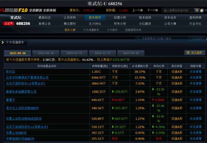 以章建平为例,今年第三季度,寒武纪单季大涨超120%。在香港中央结算有限公司、易方达上证科创板50ETF、华夏上证科创板50ETF、华夏上证50ETF等机构普遍减仓的情况下,章建平非但没有卖出,反而选择“浮盈加仓“32.02万股,其期末持股数量也升至640.65万股,显示出“章盟主”独特的投资思路。以章建平2024年年底持有寒武纪533.88万股的数量保守估算,章建平今年单靠这一只个股,盈利就已超过35亿元。