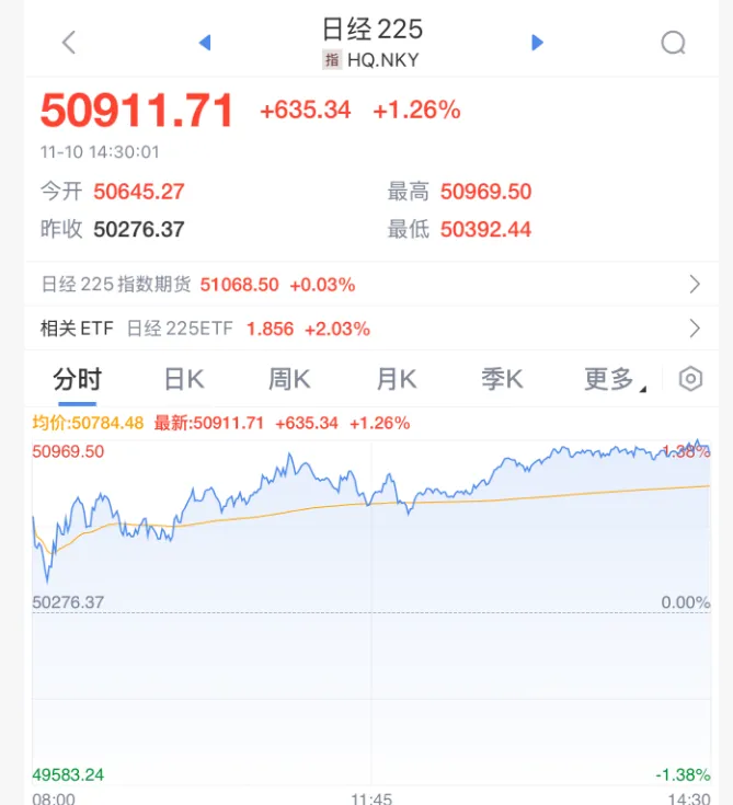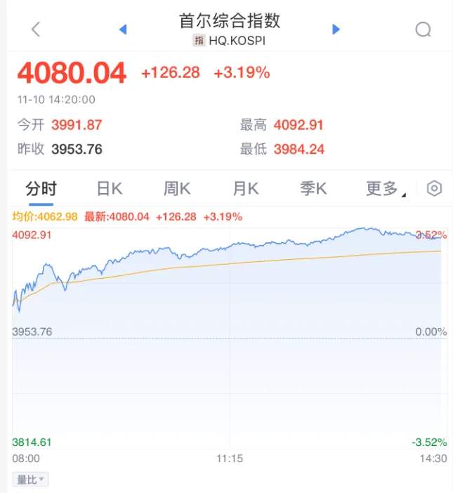 亚洲市场上,首尔综合指数涨超3%,日经225指数涨超1%。