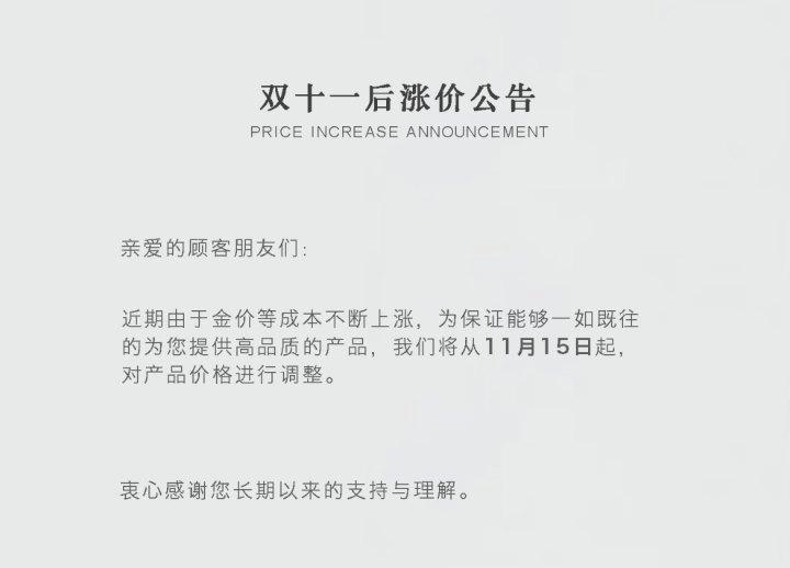另一家珠宝品牌也通过天猫旗舰店发布了双11后涨价公告:近期由于金价等成本不断上涨,将从11月15日起,对产品价格进行调整。