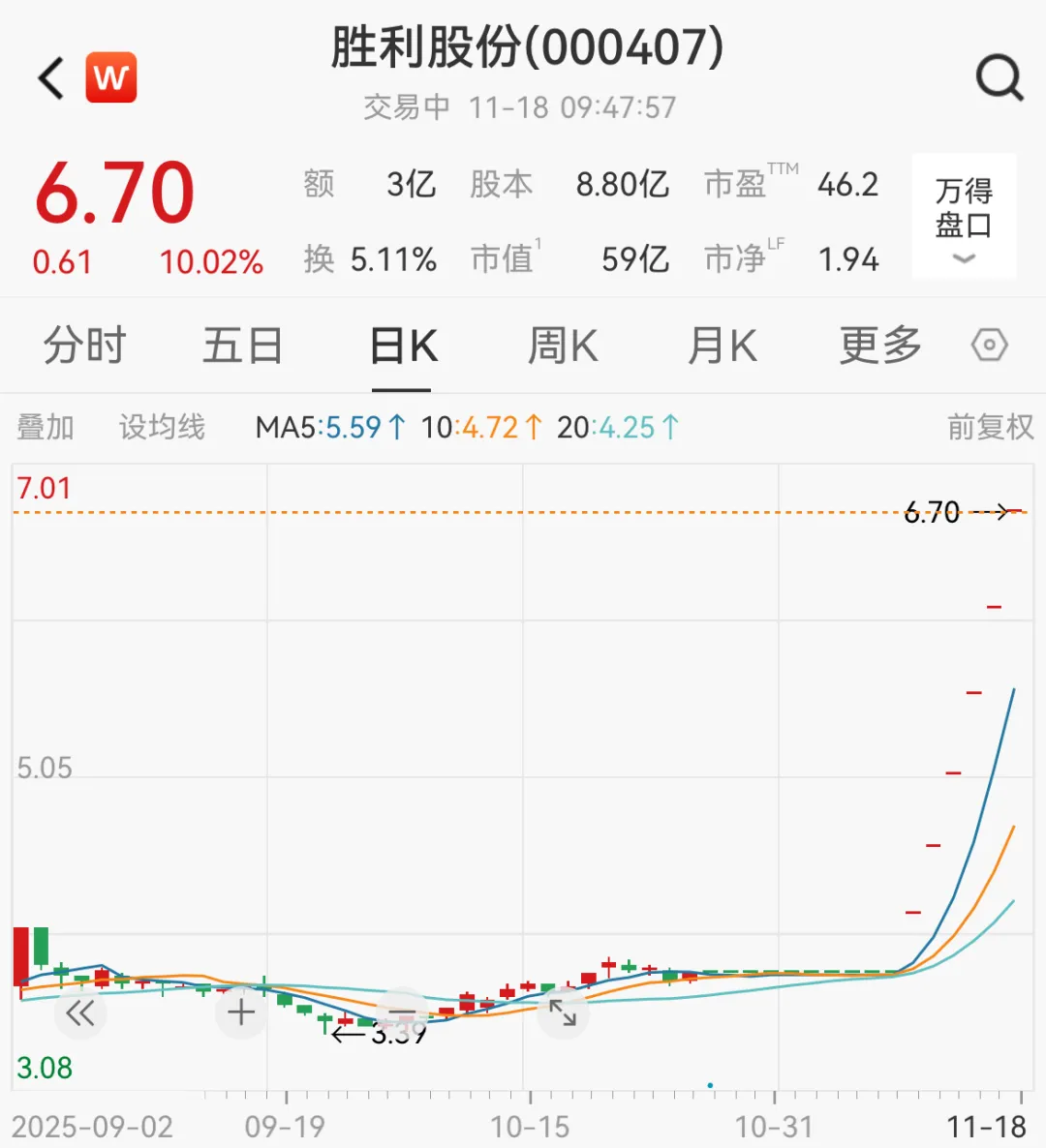11月18日早盘,胜利股份再次出现一字涨停,连收6个涨停板。