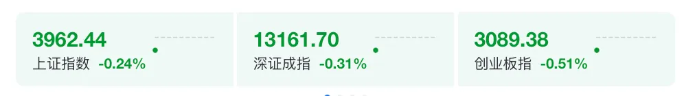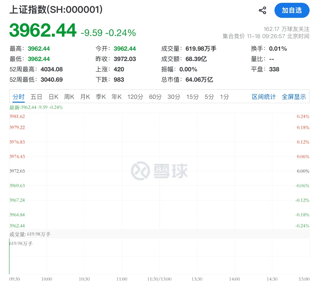 11月18日早盘,A股三大股指集体低开,沪指开盘报3962.44点,跌0.24%;深证成指跌0.31%,创业板指跌0.51%。