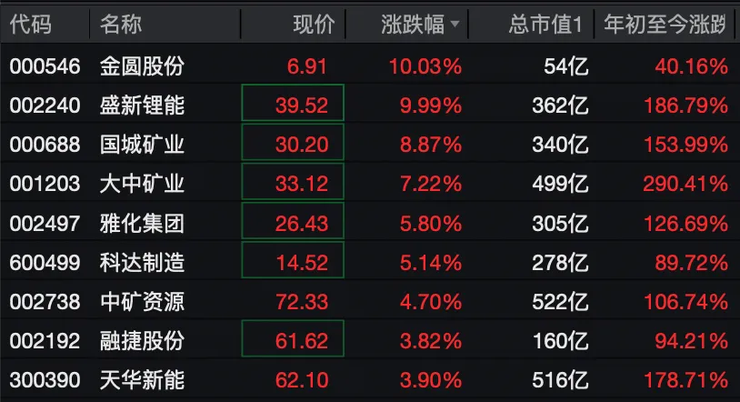 个股方面,金圆股份一字涨停,录得2连板;盛新锂能开盘一度封板,国城矿业、大中矿业、雅化集团、中矿资源等跟涨。