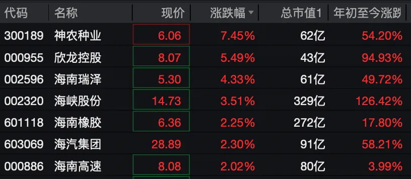 个股方面,海南海药、海马汽车封板涨停,康芝药业、神农种业、欣龙控股等多股涨超5%,*ST双城等跟涨。