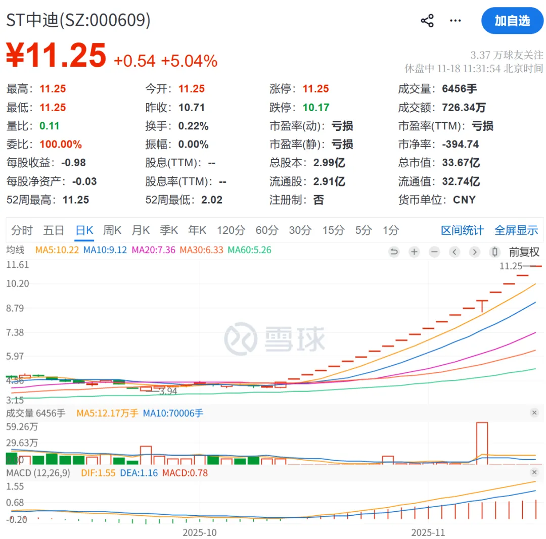 11月18日,ST中迪开盘涨停,上午保持一字涨停状态。截至午间收盘,ST中迪报11.25元/股,总市值为34亿元。今日涨停后,ST中迪成功实现20连板的战绩。
