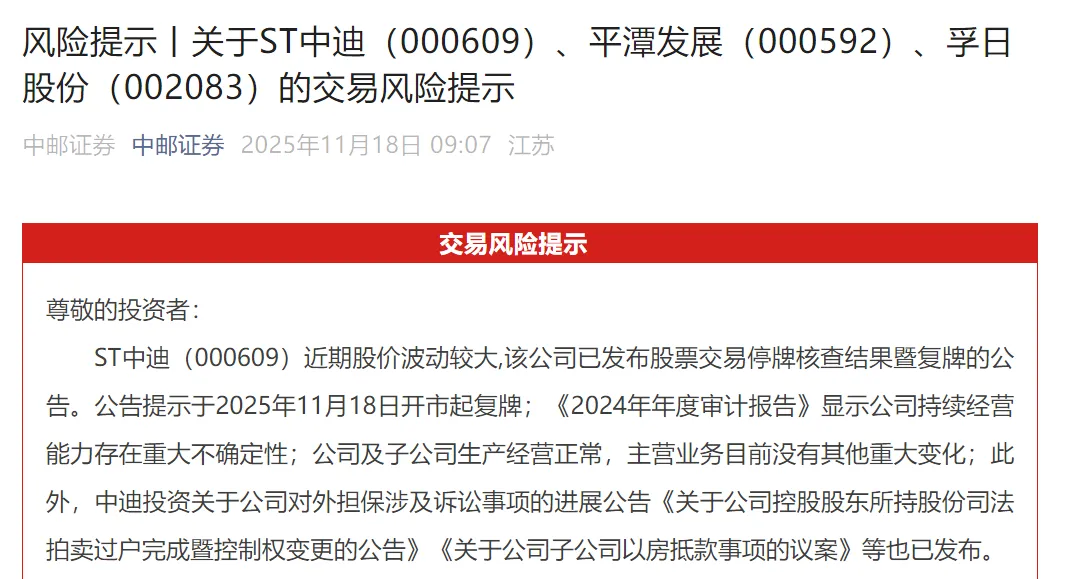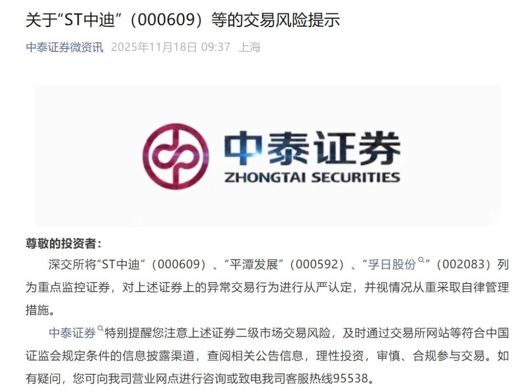 另外,ST中迪还对涉及的诸多风险事项进行风险提示。ST中迪提到,公司股价自2025年10月16日至11月12日,累计涨幅超过153.19%,其间出现七次股价异常波动,严重背离公司基本面。请投资者谨慎投资,注意炒作风险。