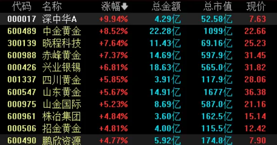 截至发稿,深中华A涨停,中金黄金涨超8%,晓程科技、赤峰黄金涨超7%,兴业银锡、山东黄金、山金国际等跟涨。