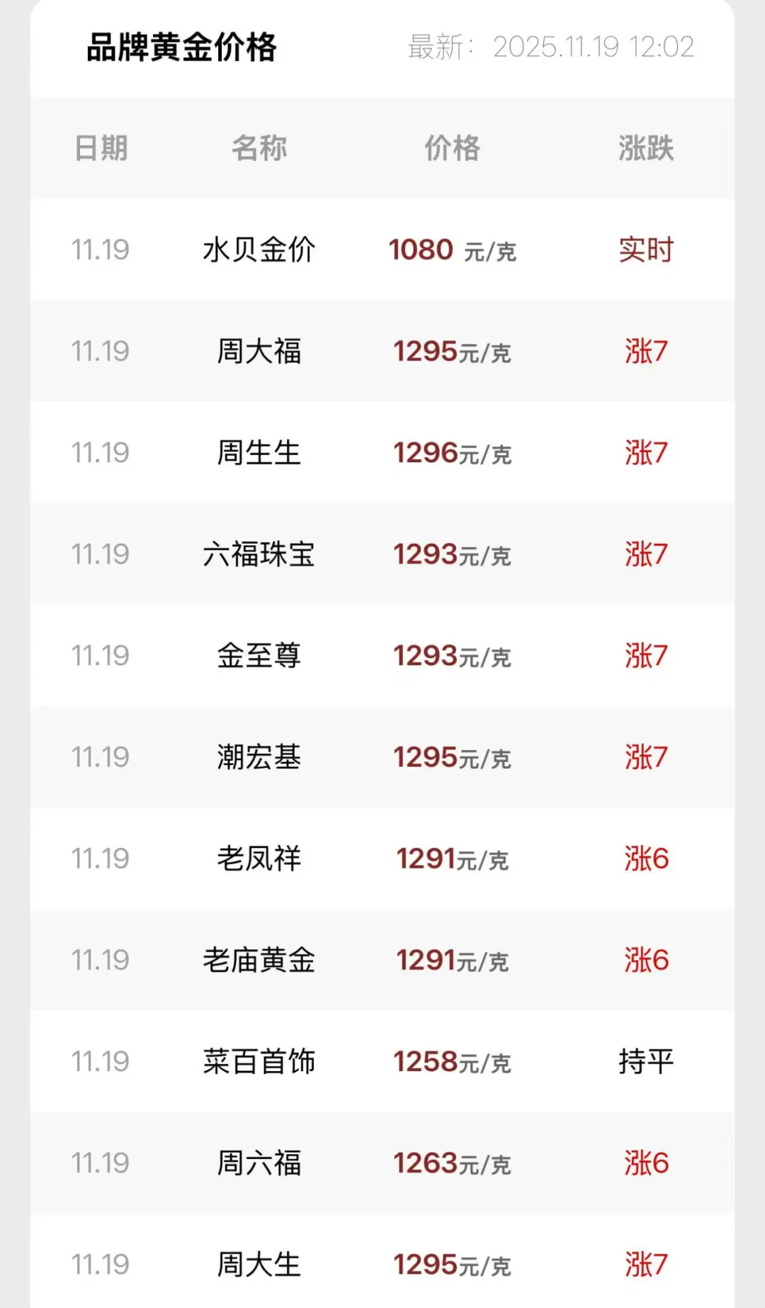北京时间11月19日,国内品牌金饰价格上调,结束四连跌。周生生足金饰品报1296元/克,较前一日的1289元/克涨7元/克;老凤祥足金饰品报1291元/克,较前一日的1285元/克涨6元/克。