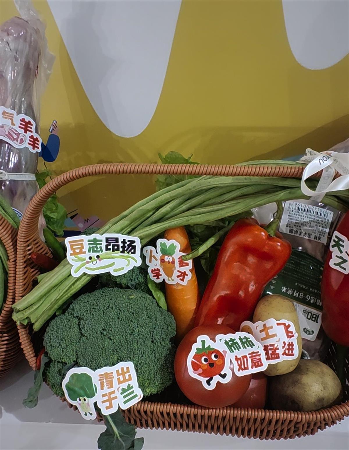 这份用装满了肉菜的菜篮子格外丰盛,既有羊腿,也有西蓝花、土豆、西红柿、胡萝卜、红辣椒、豆角、生菜等新鲜蔬菜。每个菜上面还用心写上了谐音祝福语,如“喜气羊羊”“青出于兰”“天之椒子”“土飞猛进”“豆志昂扬”“卜学多才”“生财有道”。