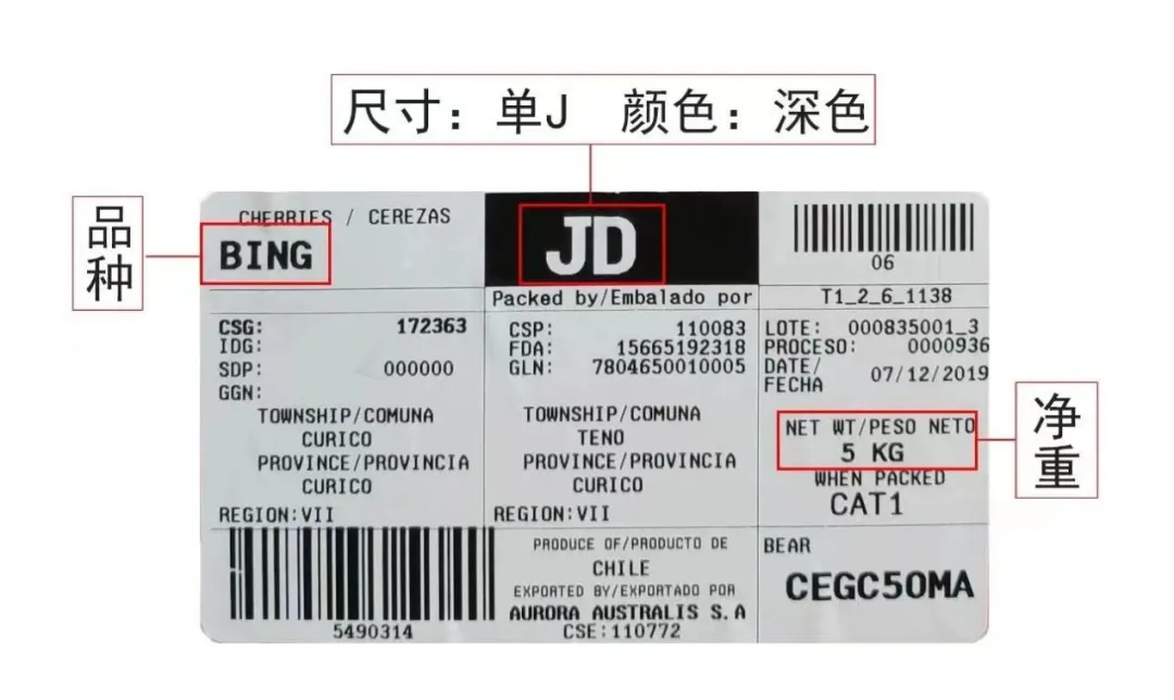 包装箱的标签注明了:品种、规格、颜色、重量、日期。
