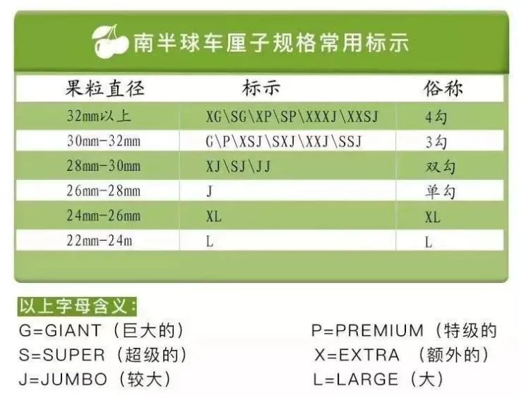 进口的车厘子大致分六个规格,这是分级包装的标准 。