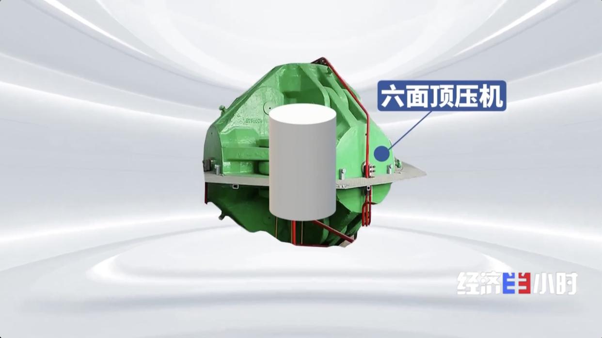 六面顶压机在运转时会完全模拟天然钻石高温高压的生长环境。天然钻石生长时间需要亿万年,但在这里,收获一克拉左右的培育钻石最快仅需一到两周。