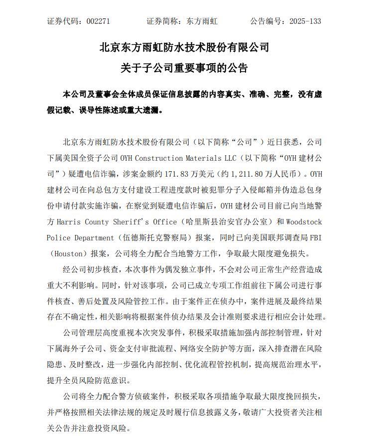 12月24日,北京东方雨虹防水技术股份有限公司(证券代码:002271,以下简称“东方雨虹”)发布关于子公司重要事项的公告,公司下属美国全资子公司 OYH Construction Materials LLC(以下简称“OYH 建材公司”)疑遭电信诈骗,涉案金额约171.83万美元(约1,211.80万人民币)。