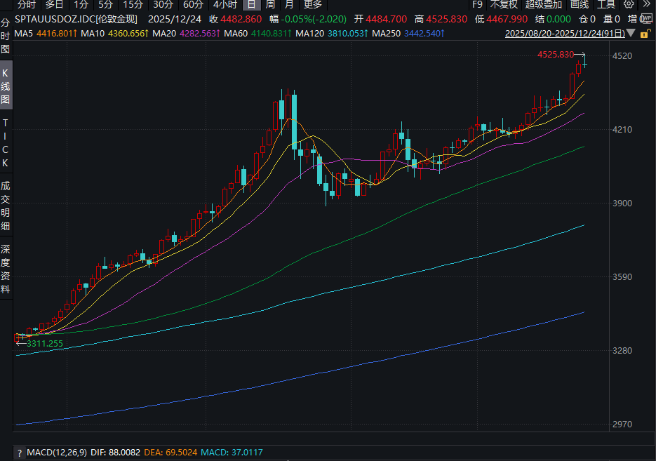 红星资本局12月24日消息,今日,伦敦现货黄金、COMEX黄金期货分别首次站上4500美元、4550美元关口,连续四个交易日维持上涨行情,年内累计涨幅均已超过70%。