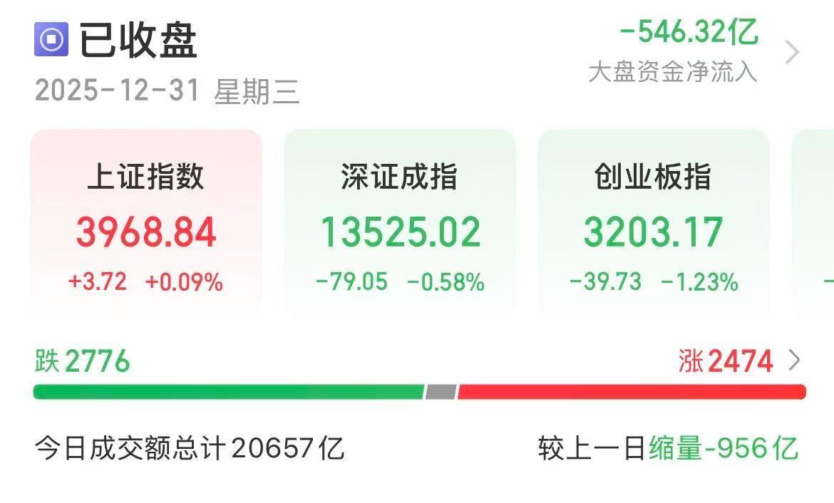 2025年最后一个交易日圆满收官,虽然节前最后一个交易日主力资金无心恋战,但A股还是将近十年来最好的记录“11连阳”保持到了最后。截至收盘,上证指数收于3968.84点,深证成指收于13525.02点,创业板指收于3203.17点,成交量较上一交易日缩量956亿元。