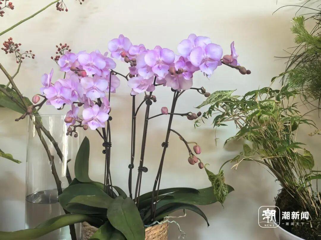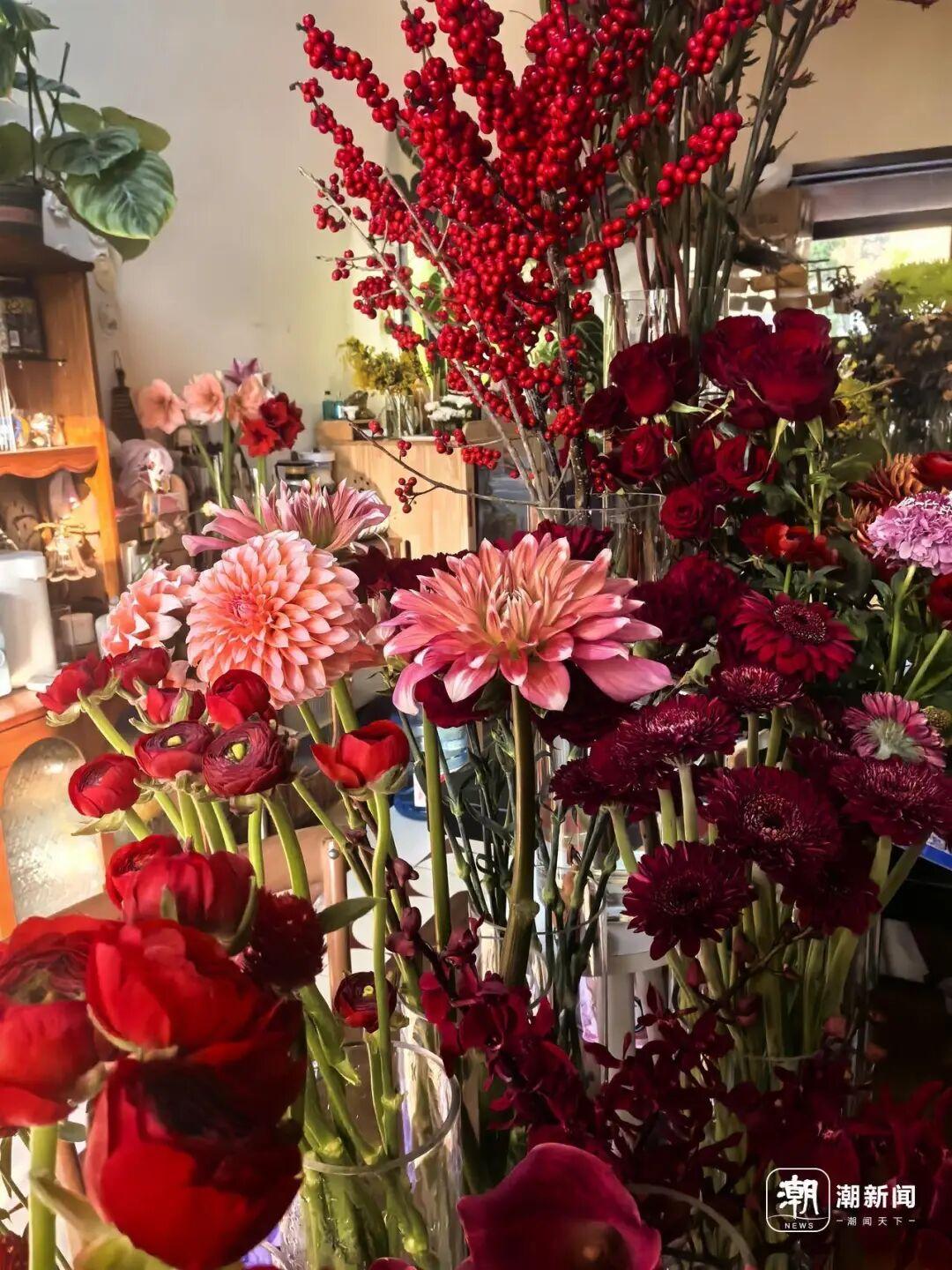 在西湘里文创园“瘾鹿花礼”花店,北美冬青、蝴蝶兰、洋牡丹等年宵花卉都已经摆上门店的“C位”。