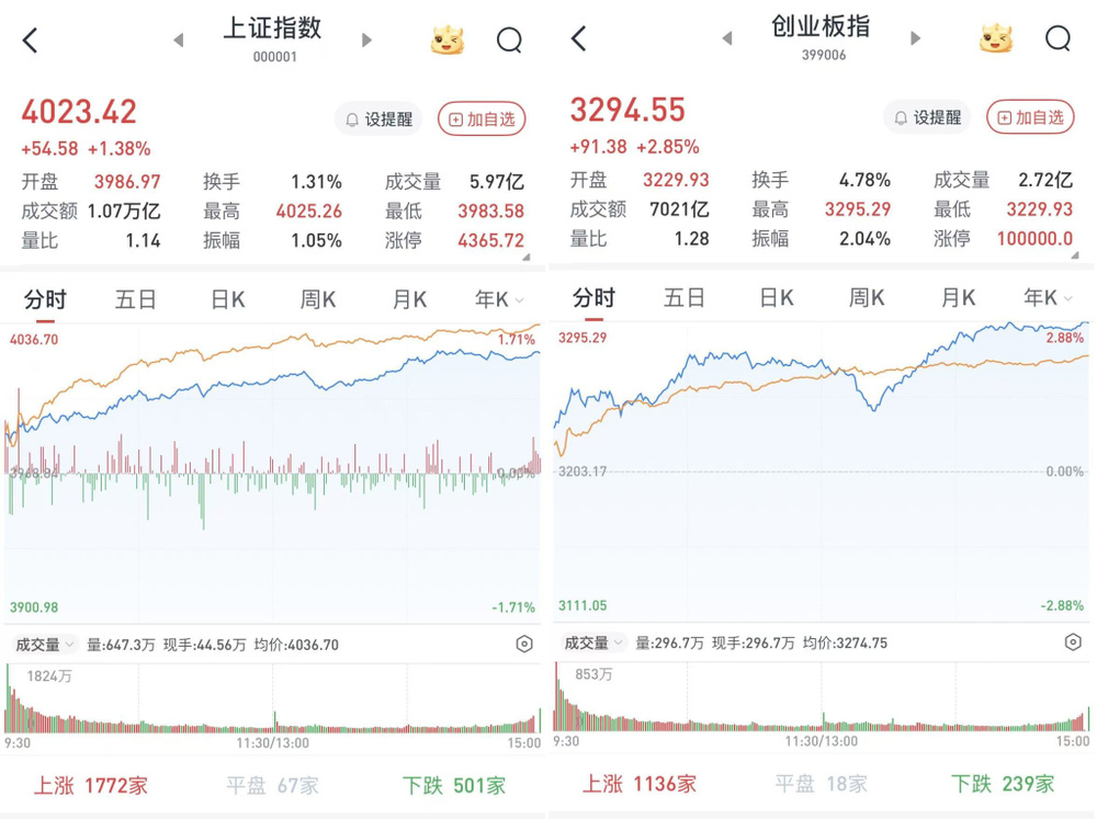 至收盘,上证综指涨1.38%,报4023.42点;科创50指数涨4.41%,报1403.41点;深证成指涨2.24%,报13828.63点;创业板指涨2.85%,报3294.55点。