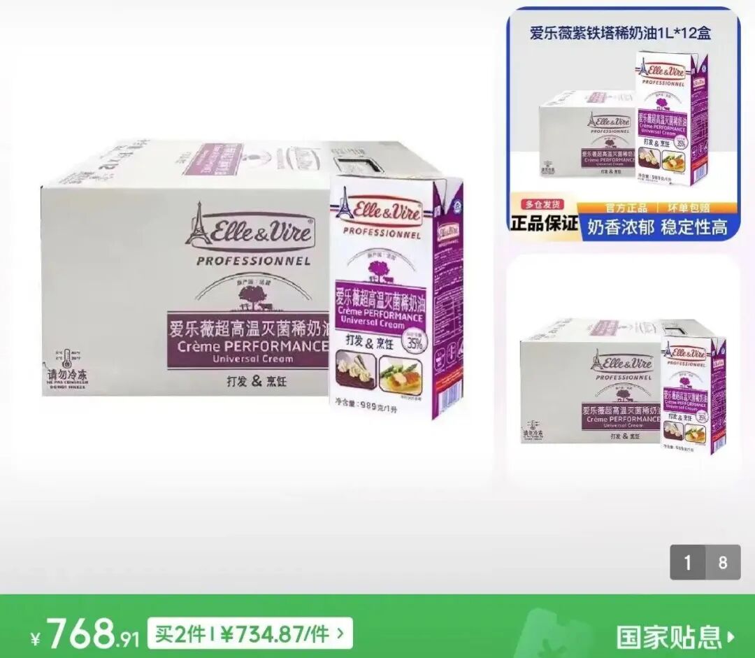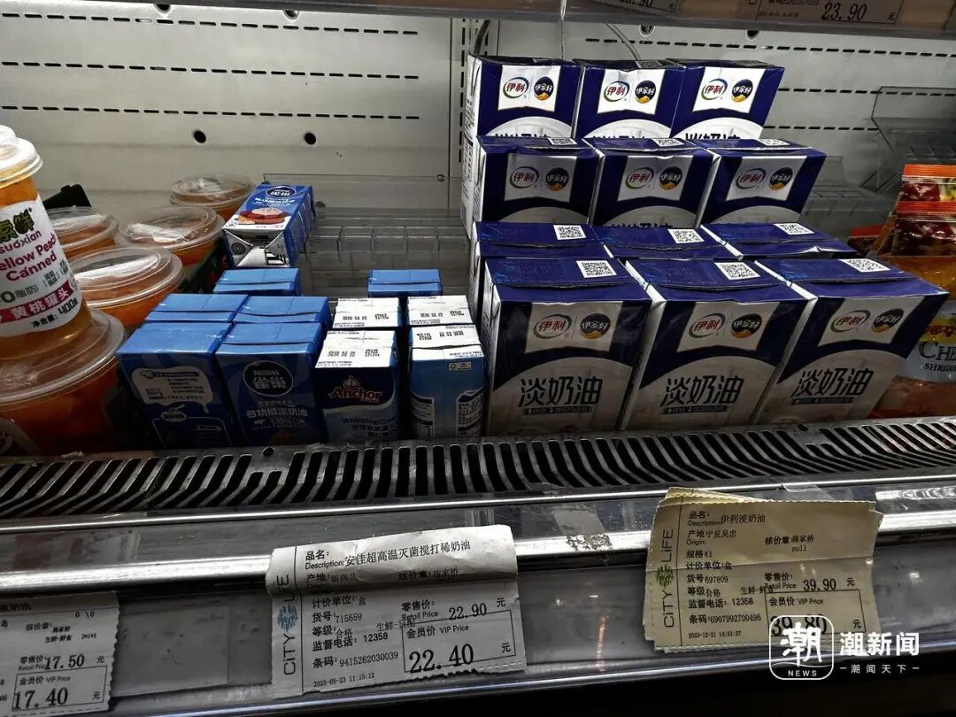 记者在连锁超市看到,适合家庭烘焙的小包装淡奶油价格相对平稳。新西兰进口的安佳250毫升装售价22.4元,国产的1升装伊利淡奶油价格约40元。网络平台上,整箱12盒1升装的安佳淡奶油售价在479-498元,价格低于蓝风车、铁塔等欧洲产区产品。