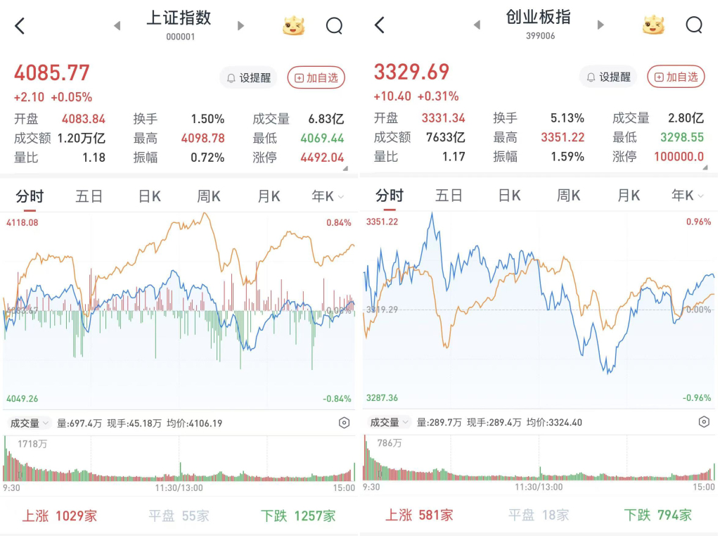 至收盘,上证综指涨0.05%,报4085.77点;科创50指数涨0.99%,报1443.39点;深证成指涨0.06%,报14030.56点;创业板指涨0.31%,报3329.69点。