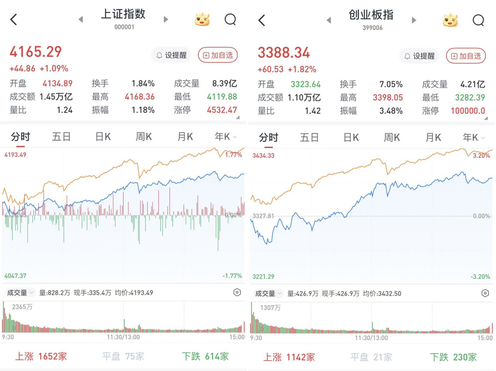 至收盘,上证综指涨1.09%,报4165.29点;科创50指数涨2.43%,报1511.84点;深证成指涨1.75%,报14366.91点;创业板指涨1.82%,报3388.34点。