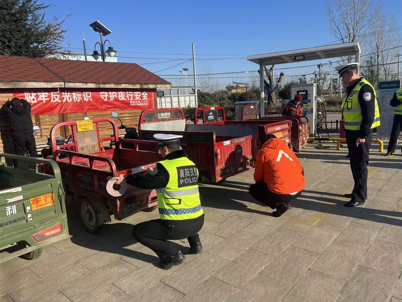 冬季昼短夜长,农村道路照明设施相对薄弱,电动车、三轮车夜间行驶因可视性差易引发追尾事故,成为乡村道路安全的突出隐患。基于对农村道路风险特征的精准研判,平安产险襄阳中支联合交管部门组建专项服务团队,在活动现场形成“粘贴防护+宣教引导”的闭环服务模式。工作人员分工协作,将高亮度反光条规范粘贴在车辆尾部、侧面等关键位置,确保夜间车灯照射下能清晰反光,让车辆“被看见、更安全”;同时结合襄阳本地农村道路典型事故案例,用通俗易懂的“家常话”拆解事故成因,向村民普及反光条日常养护、夜间骑行必开灯、拒绝逆向行驶等安全知识,引导村民摒弃交通陋习,将安全出行理念深植于心。