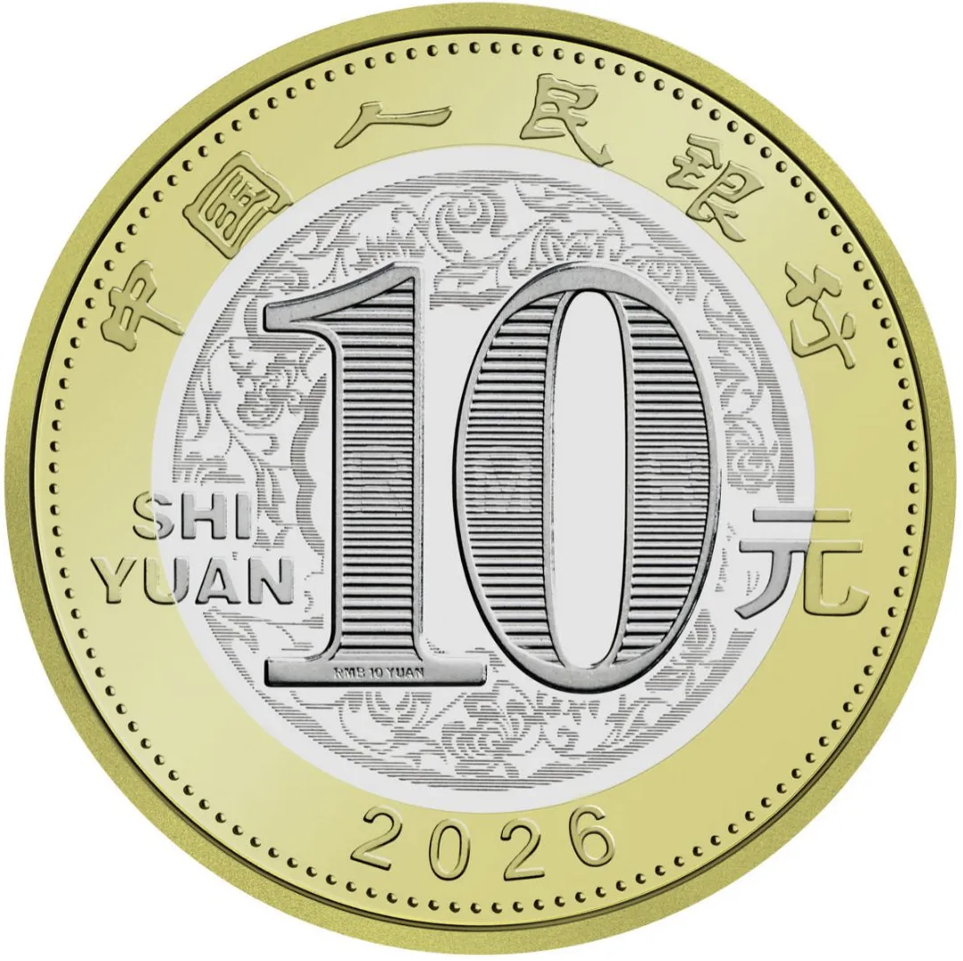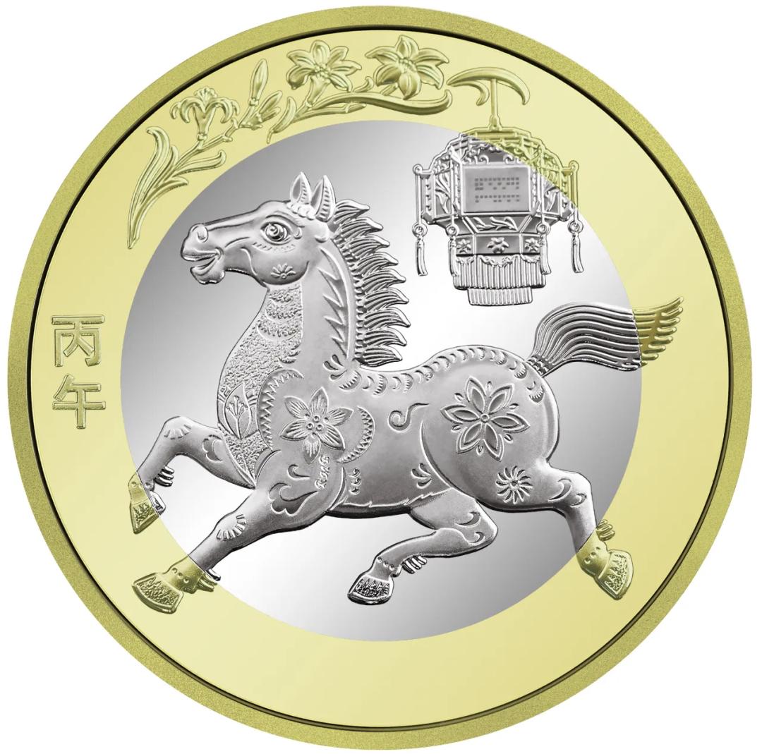 根据人民银行公告,马年贺岁纪念币材质为双色铜合金,面额10元,发行数量为1亿枚(含留存历史货币档案1万枚)。双色铜合金纪念币背面图案为中国传统剪纸艺术与装饰年画元素相结合的马形象,衬以花灯和萱草图案,币面左侧刊“丙午”字样。