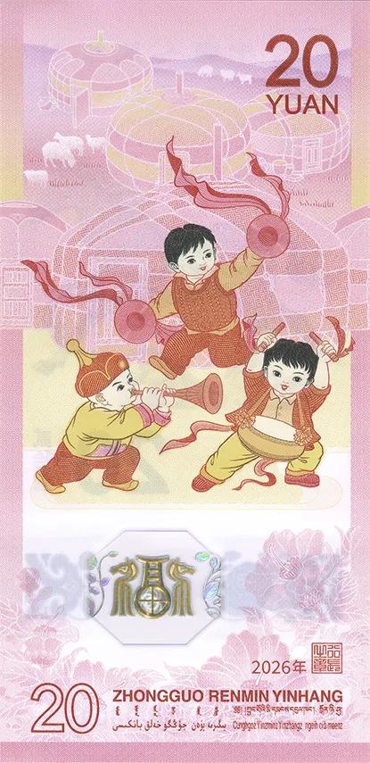 纪念钞面额20元,采用塑料材质,发行数量为1亿张(含留存历史货币档案2万张)。纪念钞正面主景为马的造型图案,下方依次为光彩光变面额数字“20”与汉字“贰拾圆”、动感全息图案、透明视窗、盲文面额标记和冠字号码。背面主景为儿童欢庆锣鼓图案,辅以蒙古包装饰图案。
