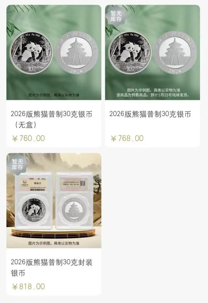 昨天,“金币云商”App显示,陆先生此前花598元一枚购买的2026版熊猫币普制30克银币,昨天最新价格为768元(无库存),而封装版的已经涨到了818元(无库存)。