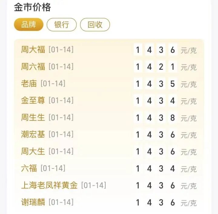 而从各大黄金饰品来看,相比前天,周大福首饰金报价1436元/克,单日上涨10元/克;周生生金饰报1438元/克,单日上涨6元/克;老庙黄金报1435元/克,单日上涨8元/克;老凤祥报1436元/克,单日上涨8元/克。