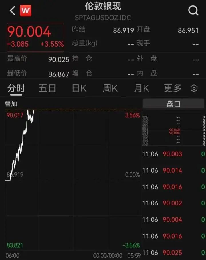 伦墩现货白银冲破90元/盎司
