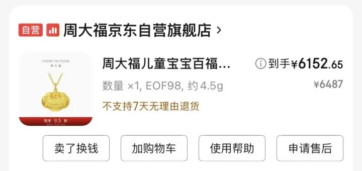 陈女士说,这个锁在购物车里躺了好几个月,越观望越下不了手。每天上午10点是周大福官方更新报价的时间,前天她觉得实在不能再等了,趁客服还没上班改价,果断出手。