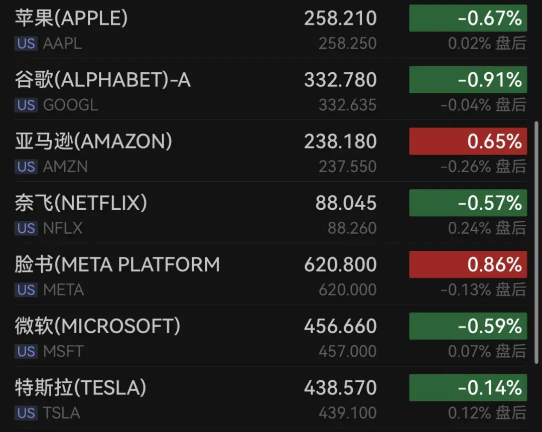 大型科技股涨跌互现,英伟达涨超2%,脸书涨0.86%,亚马逊涨0.65%,谷歌跌近1%,苹果跌0.67%,微软跌0.59%,特斯拉跌0.14%。
