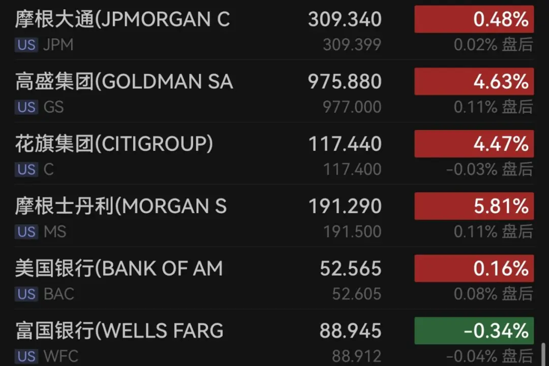 银行股多数上涨,摩根大通涨0.48%,高盛涨超4%,花旗涨逾4%,摩根士丹利涨近6%,美国银行涨0.16%,富国银行跌0.34%。