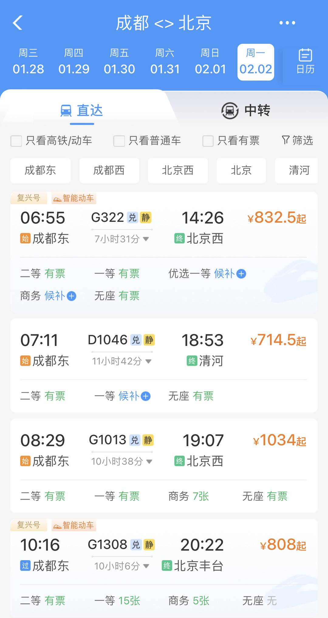 成都车站工作人员介绍,省外方面,北京、昆明、贵阳是春运首日出行热门方向。记者查询发现2月2日当天,成都东至北京西G322次、G1592次列车的部分席位已售罄;成都至昆明G2837、G2851、D271等多趟列车部分席位售罄。