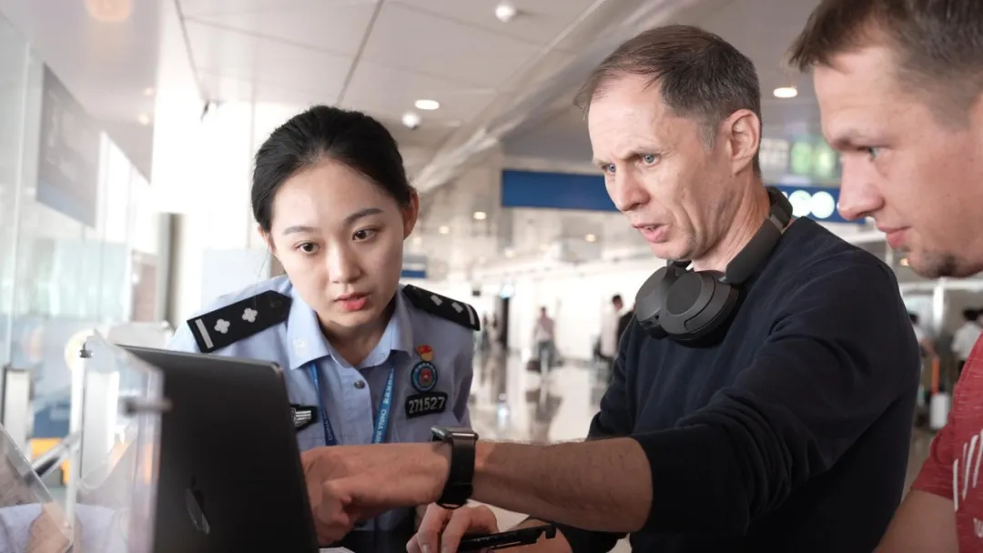 武汉边检站民警指导天河机场外籍旅客线上填报外国人入境卡