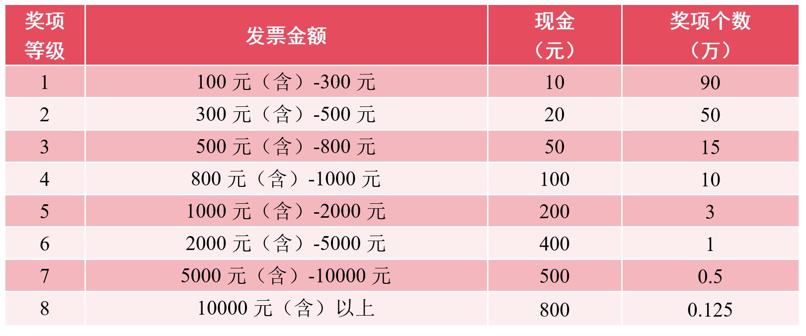 奖金按发票金额共设置8个等级奖项,10元-800元不等,中奖后奖金通过“云闪付”APP及时兑付至中奖者银行卡账户。