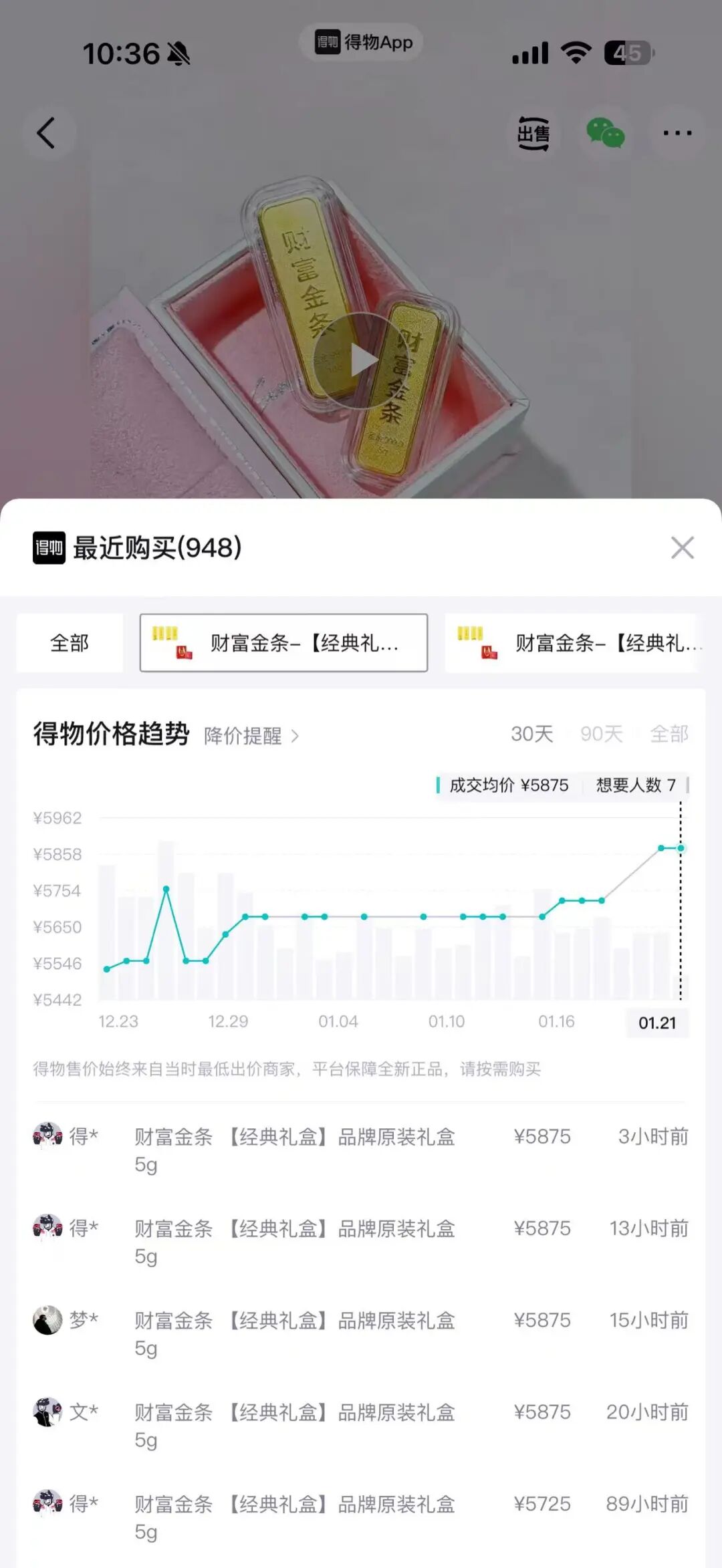 此外,据得物App显示,以“老凤祥-投资金条”为例,5g价格近1个月内由成交均价5355元上涨至5875元,增幅明显。