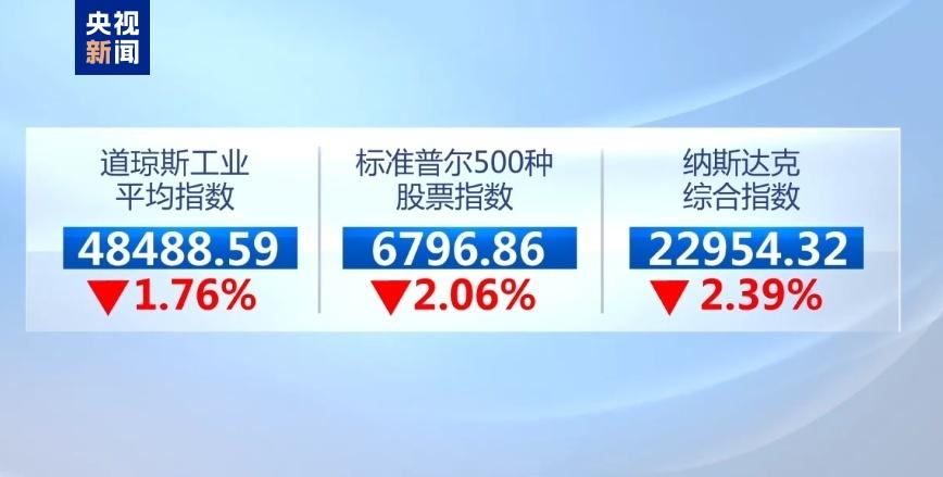 随着欧美围绕格陵兰问题的对峙不断升温,美国总统特朗普威胁对多个欧洲国家提高关税,投资者避险情绪迅速升温。20日,纽约股市三大股指全线下挫。截至当天收盘,道琼斯工业平均指数比前一交易日下跌870.74点,跌幅为1.76%;标准普尔500种股票指数下跌143.15点,跌幅为2.06%;纳斯达克综合指数下跌561.06点,跌幅为2.39%。(总台记者 赵淼)