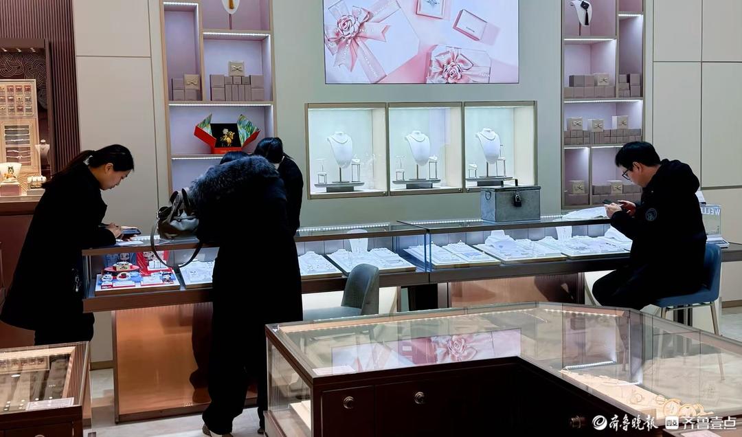 21日,济南线下某商场品牌金店内,消费者在挑选金饰。