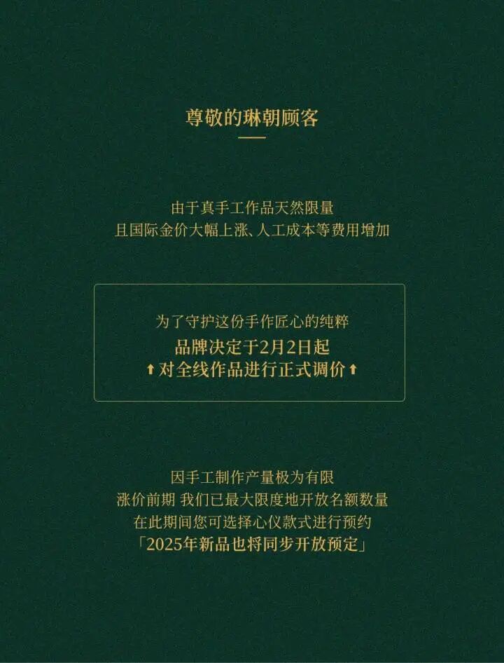 就在前天,琳朝再次宣布,因为真手工作品天然有限,且国际金价大幅上涨、人工成本等费用增加,从2月2日起对全线作品正式调价。同时,银行金条价格也大幅上调。截至发稿前建行实物金条售价为1128.90元/克;工行实物金条价格为1129.22元/克。