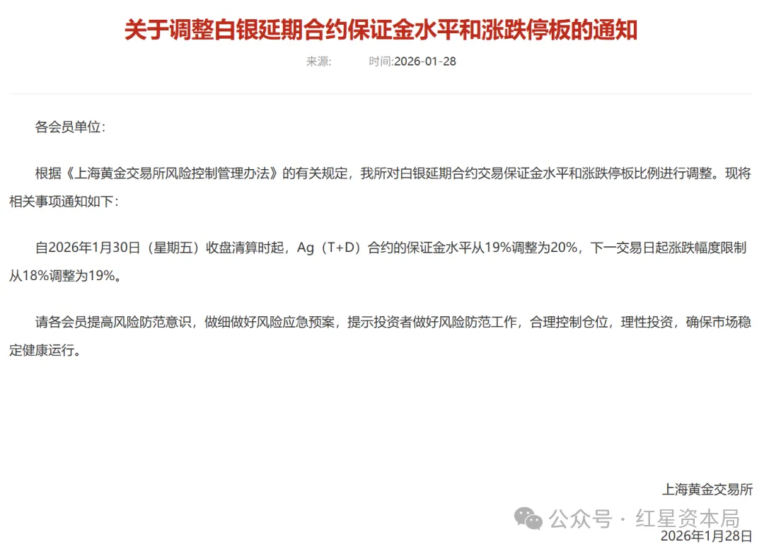 1月28日,上海黄金交易所发布通知,根据《上海黄金交易所风险控制管理办法》的有关规定,我所对白银延期合约交易保证金水平和涨跌停板比例进行调整。现将相关事项通知如下:自2026年1月30日(星期五)收盘清算时起,Ag(T+D)合约的保证金水平从19%调整为20%,下一交易日起涨跌幅度限制从18%调整为19%。