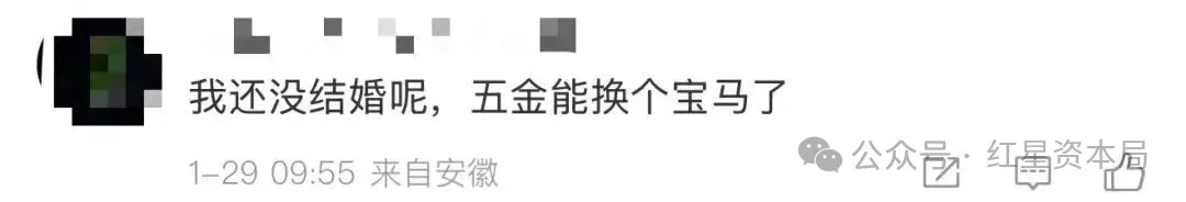 有网友表示:还没结婚呢,五金能换台宝马了。