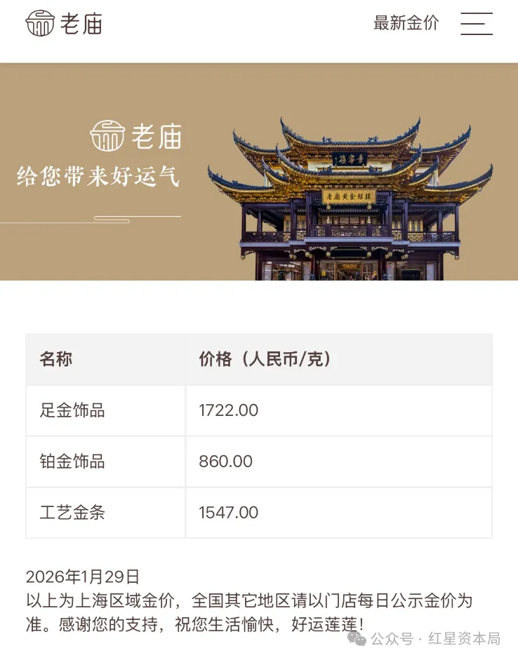 受此影响,部分国内品牌金饰价格也创历史新高,单日上涨百元左右。红星资本局29日查询发现,老庙黄金为1722元/克,单日上涨104元,周生生为1708元/克,单日上涨94元;老凤祥为1713元/克,单日上涨93元。