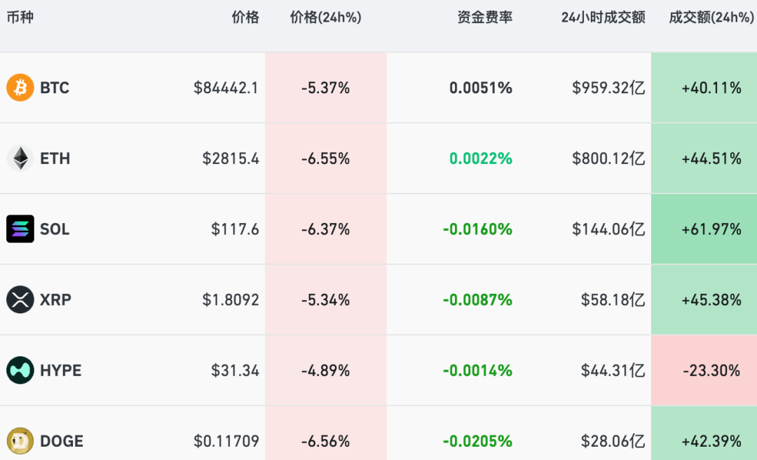 加密货币主要币种集体飘绿,截至北京时间6:30,比特币跌超5%,价格跌破84500美元/枚,以太坊、SOL、DOGE等跌超6%。最近24小时,全球共有超22万人被爆仓,爆仓总金额超10亿美元。