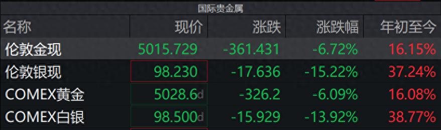 截至发稿时,现货黄金和现货白银的跌幅略有收窄,不过仍有6%和15%。年初至今的涨幅收窄至16%和37%左右。